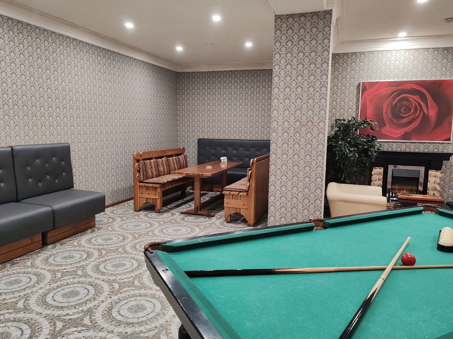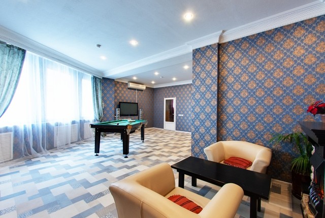 Помимо этого в помещении установлен бильярдный стол и имеется необходимый инвентарь для игры. Те, кто предпочитают спокойный отдых могут почитать книгу у камина или заказать услугу массажа.